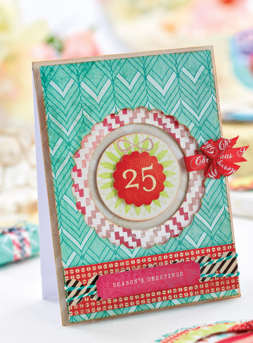 2 Make a scalloped frame and fix with the foam pads. Attach ‘Dec 25’ sticker. Take the die-cut bauble and adhere to the centre. Add a bow for decoration.